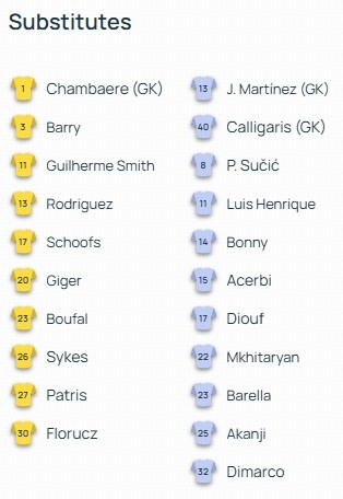替补队员:13号何塞普-马丁内斯、40号卡利加里斯、8号苏契奇、11号路易斯-恩里克、14号博尼、15号阿切尔比、17号迪乌夫、22号姆希塔良、23号巴雷拉、25号阿坎吉、32号迪马尔科