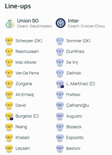 国际米兰先发:1号索默、95号巴斯托尼、2号邓弗里斯、6号德弗赖、31号比塞克、30号奥古斯托、20号恰尔汗奥卢、16号弗拉泰西、7号泽林斯基、94号皮奥-埃斯波西托、10号劳塔罗